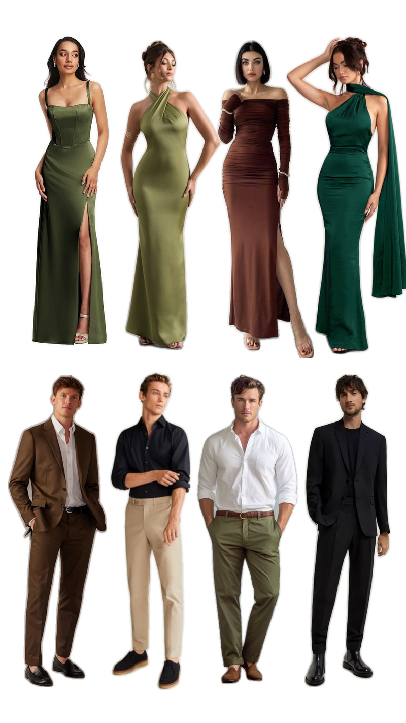 Para as mulheres, vestidos e conjuntos são perfeitos para a ocasião. Por favor, evitem tons claros e branco, para que possamos preservar a tradição e a elegância do dia. E um detalhe especial: o verde esmeralda é exclusivo para as nossas queridas madrinhas!